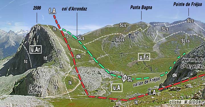 Entre la latitude du Petit Argentier et celle des chalets d'Arrondaz la bande de schistes lustrés intercalée entre les deux cassures N-S disparaît en faisant place vers le nord à une puissante masse de gypses et des cargneules, que borde du côté est la puissante lame de Trias briançonnais de l'unité d'Arrondaz).