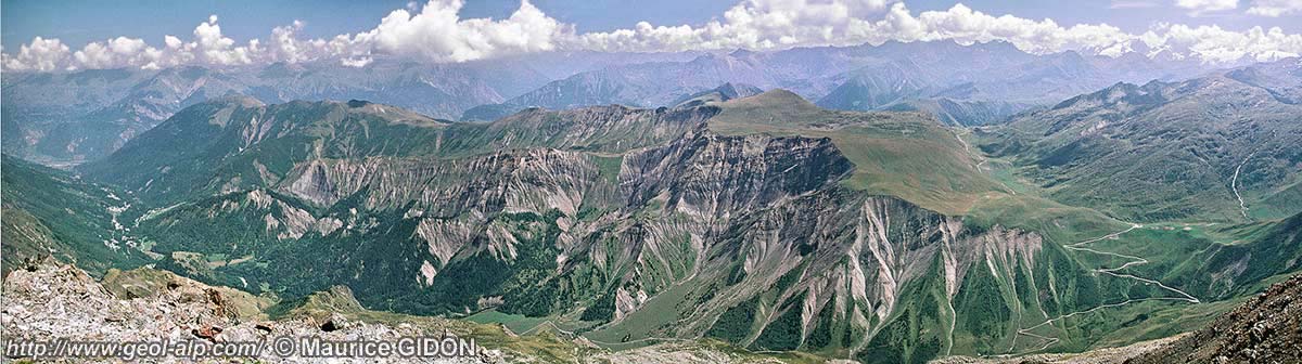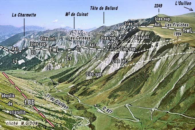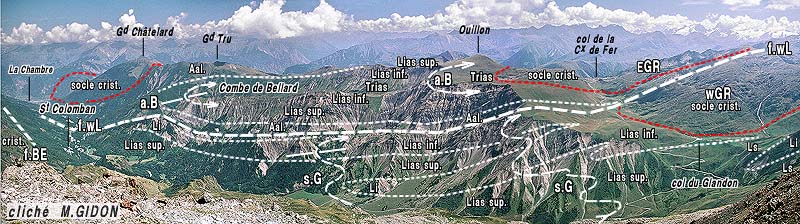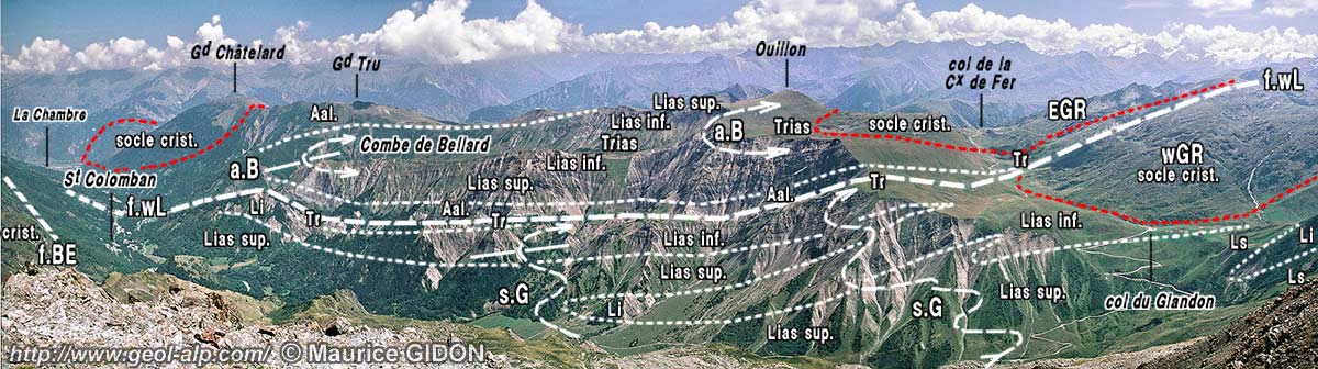 ![]() La rive droite (orientale) de la vallée des Villards, vue panoramique prise du sud-ouest, depuis la cime du Sambuis. f.BE = faille orientale de Belledonne ; s.G = synclinorium* du Glandon ; a.B = anticlinal de la combe de Bellard ; WGR = bloc de socle des Grandes Rousses occidentales ; EGR = bloc de socle des Grandes Rousses orientales ; f.wL = faille occidentale du graben des lacs de Saint- Sorlin, qui partage en deux le bloc cristallin du massif des Grandes Rousses. Dans ce chaînon de l'Ouillon - Grand Truc, le matériel sédimentaire dauphinois recouvre le bloc cristallin des Grandes Rousses et ses plis s'enfoncent régulièrement vers le nord, comme la voûte de ce bloc. En outre on y suit l'accident de socle "f.wL" sous l'aspect d'un "pseudo-chevauchement" (voir ci-après), dont le tracé va à la rencontre de la faille orientale de Belledonne Par contre, à la différence de la surface du socle cristallin, qui ne dessine qu'un large anticlinal, partagé en long par la paléo-faille f.wL, la couverture sédimentaire est affectée de plis serrés, plus ou moins isoclinaux et couchés vers l'ouest (analysés ci-après). |