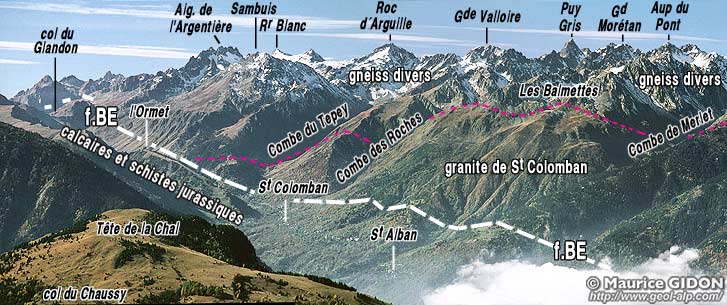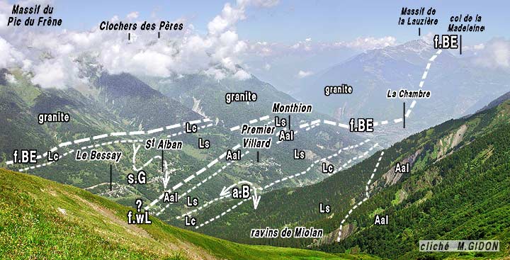 ![]() Le versant nord-occidental de la vallée des Villards : vue d'ensemble, du nord-est, depuis le col de Valbuche. f.BE = faille de la bordure orientale de Belledonne. Les tirets roses marquent la limite entre le granite et les roches métamorphiques du massif d'Allevard (non différenciées). Noter son obliquité par rapportà la f.BE |