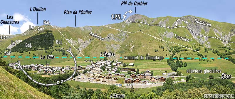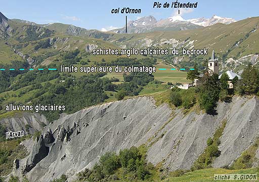 Ce colmatage prolonge celui qui détermine, sur la rive orientale de l'Arvan, le replat des Albiez. Il fait partie d'une vaste nappe alluviale, sans doute alimentée en partie par des appareils glaciaires locaux et en partie par le glacier qui occupait la vallée de la Maurienne. Elle s'est accumulée dans les vallées affluentes de l'Arc à une époque où la vallée principale de cette rivière était comblée par ce glacier jusqu'à une altitude de l'ordre de 1600 à 1500 m. |