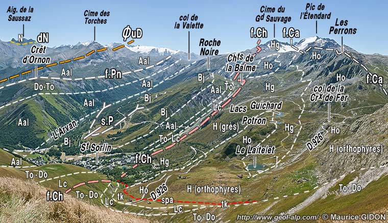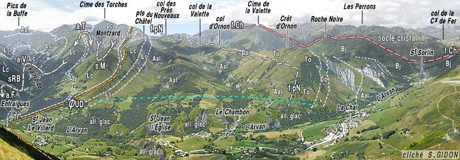 ![]() même fenêtre La vallée de L'Arvan au niveau de Saint-Jean-d'Arves et les montagnes de sa rive droite, vues de l'est, depuis le sommet du Mont Charvin (cliché original obligeamment communiqué par M. Serge Gidon). De droite à gauche : f.Ch = faille du Chambon (limite orientale du bloc de socle cristallin des Grandes Rousses) ; f.pN = faille du col des Prés Nouveaux ; ØUD = chevauchement de la zone ultradauphinoise ; s.M = synclinal du Montzard ; a.T = anticlinal des Torches ; a.V = anticlinal de Valfroide ; s.RB = synclinal du Rieu Blanc ; a.F = anticlinal du Mont Falcon (concernant ces derniers plis voir la page "Mont Falcon") Les tirets émeraude indiquent approximativement le sommet du colmatage d'alluvions glaciaires. |