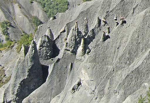 Le hameau de L'Église, au dessus de Saint-Jean-d'Arves Le ravin entaille l'épais colmatage morainique qui supporte les prairies et les rares cultures des basses pentes de la vallée. La coupe qu'il en donne a un aspect très caractéristique, avec ses blocs isolés noyés dans la matrice argilo-sableuse et ses multiples ravines séparées par des crêtes acérées. Quelques "demoiselles coiffées" commencent à se former sur ces crêtes mais leur avenir est compromis car certaines ont déjà perdu leur chapeau et, pour la plupart, celui-ci a une taille insuffisante pour se préserver un socle assez large : agrandissement de ce détail sur la photo ci-contre. |