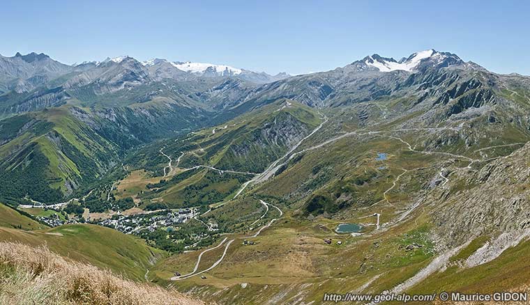 En amont de Saint-Sorlin la vallée se ferme en cul de sac contre le fort épaulement rocheux qui domine les maisons supérieures de l'agglomération. Cet épaulement, qui soutient le replat situé au pied des dernières pentes du col de la Croix de Fer, a été façonné par les glaciers au maximum de leur extension, mais il a une origine structurale : c'est en effet le rebord des affleurements de socle cristallin du rameau oriental du bloc de socle des grandes Rousses, qui ne disparaît qu'au nord du col de la Croix de Fer, en s'enfonçant sous sa couverture sédimentaire (voir la page "Ouillon").