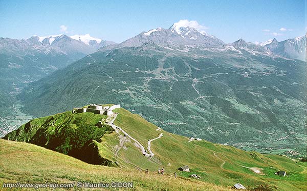 L'agglomération de bourg-Saint-Maurice elle-même est construite en aval du débouché de la vallée du Torrent des Glaciers, qui descend des Chapieux, sur les cônes de déjections* coalescents des torrents de L'Arbonne, du Nantet et du Charbonnet, qui drainent les pentes orientales du chaînon du Roignais. Ces pentes, d'abord raides s'adoucissent fortement vers le haut en se garnissant d'alpages au niveau du Fort de la Platte et se prolongent en un balcon qui domine le lit du torrent de Charbonnière jusqu'aux Lacs de Forclaz. Ce niveau de replats supporte les pitons rocheux du Roc de l'Enfer et des Deux Antoines, qui représentent l'extrémité sud-orientale de la crête qui descend du Roignais par la Pointe et le Col de Leisette (voir la page "Roc de l'Enfer").