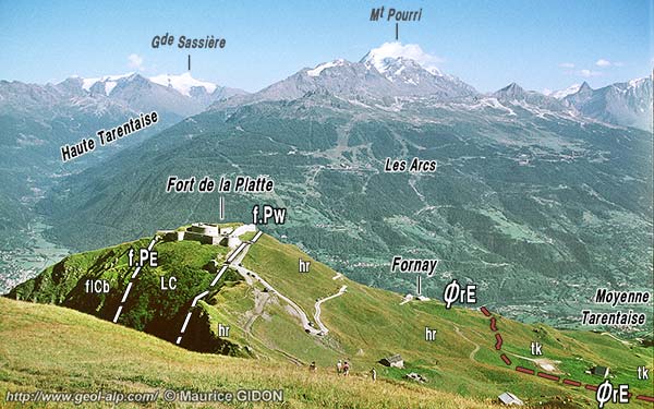 c) à l'ouest de la Bourgeat, suivant une ligne qui s'élève jusqu'au Fort de La Platte en passant par le Fort du Truc les affleurements du matériel de la nappe des brèches de Tarentaise disparaît définitivement. Il passe là apparemment un accident orienté NW-SE (la faille orientale de la Platte), qui abaisse ce matériel et à l'ouest duquel se développe une importante masse de gypses et cargneules que les ravins de rive gauche de l'Arbonne dissèquent profondément en dessinant de forts rentrants dans le versant.