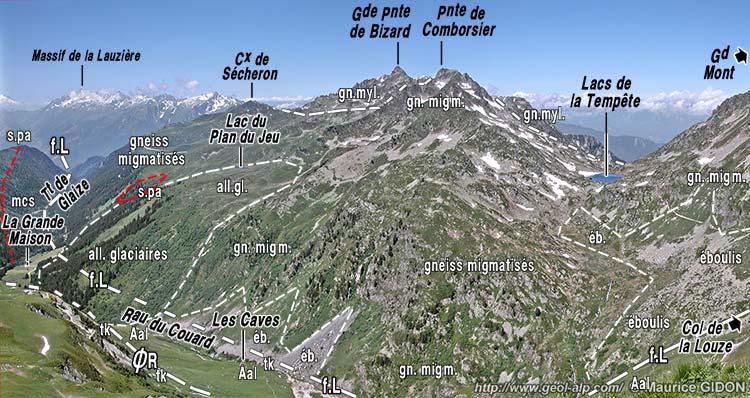 Plus bas, en aval du hameau de la Grande Maison, le thalweg de la vallée s'encaisse au contraire en contrebas de la surface de la pénéplaine anté-triasique. Le tracé du lit du torrent de Glaize a néanmoins une origine structurale car il y suit faille sub-verticale, laquelle constitue, par sa direction, le prolongement évident de la faille de La Louze. En effet les migmatites de la rive droite font brutalement place, en rive gauche, à des roches assez différentes (il s'agit en effet d'un complexe plus micaschisteux, formé de gneiss mylonitiques mais aussi de schistes noirs à niveaux de conglomérats, lesquels évoquent plutôt les formations attribuées au Carbonifère ancien dans d'autres secteurs des massif cristallins externes). De plus on observe ponctuellement en fond de thalweg un affleurement de cargneules (il est à présumer qu'il appartient à une bande continue, qui est masquée ailleurs sous les éboulis et glissements rocheux du bas versant de rive gauche).