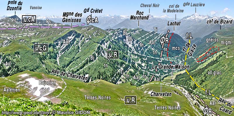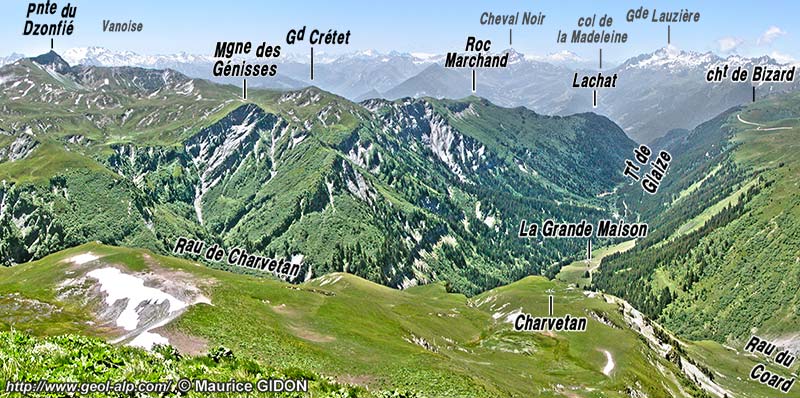 Le matériel constitutif de cette unité, essentiellement argilo-schisteux, se développe de façon monotone et sur une grande surface, depuis la crête de partage des eaux avec le bassin du Doron du côté NE (crête de Riondet et de Charvetan), jusqu'au pied des escarpements de la crête Dzonfié-Quermoz du côté SE. (voir la page "Riondet").
