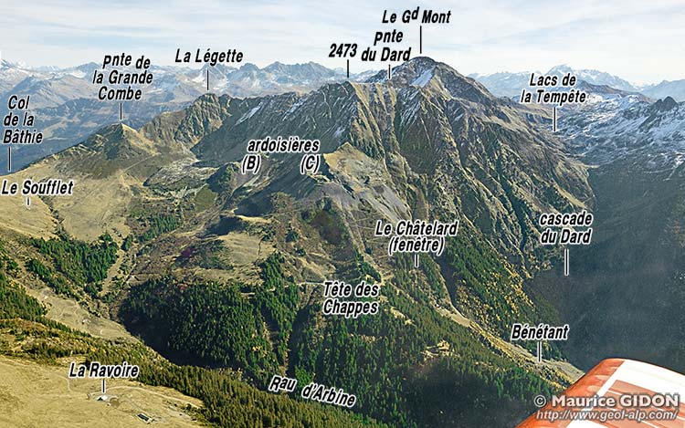 Le caractère tectonique de ce contact est en outre souligné par la présence de quelques minces copeaux de mylonite de roches cristallines. A part quelques minces affleurements discontinus de Lias supérieur les termes les plus anciens de cette succession sont encore des schistes argileux aaléniens, qui y alternent avec les marnes des Terres Noires : cette dernière disposition montre que la partie inférieure de cette unité est, comme partout et à tous niveaux, affectée de plis couchés aplatis et étirés. En outre on y constate, comme plus au nord à la Roche Parstire, l'absence, apparemment stratigraphique, des marno-calcaires bajociens, entre Aalénien et Terres Noires. |