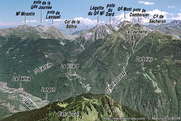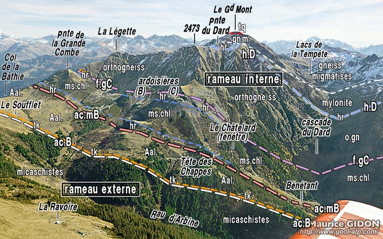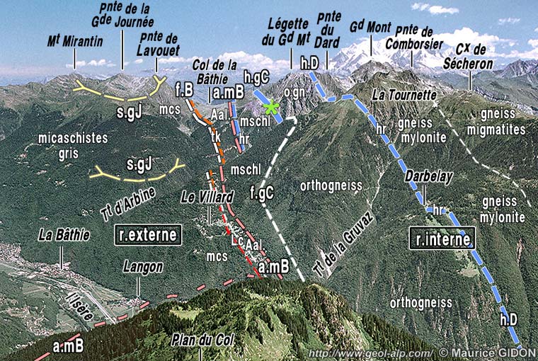 Concernant l'accident médian de Belledonne il est à noter que, dans les basses pentes du versant Tarentaise, au dessus de Cevins, une lame continue de Lias calcaire s'intercale sous les schistes aaléniens qui forment le contenu principal du graben sédimentaire qui jalonne cet accident. Cette lame est plaquée, par l'intermédiaire de quelques copeaux de dolomies triasiques, sur la surface très inclinée vers le SE des micaschistes du massif du Mirantin. Cette disposition suggère que l'on a affaire là à un contact stratigraphique redressé et tectonisé ; mais plus haut, entre Bénétant et le col de la Bâthie, les schistes aaléniens sont seulement séparés des micaschistes par une lame de cargneules qui se complète par des gypses au nord du col ; d'autre part ce contact est une faille franche au niveau de Beaufort. En définitive il est difficile de préciser la nature et l'âge des mouvements qui ont affecté cette limite orientale du rameau externe de Belledonne, ce qui porte à se limiter à lui attribuer le nom, délibérément peu explicite, d'accident de Beaufort - col de la Bâthie. |