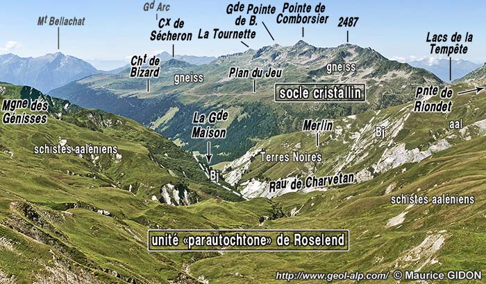 Sur cette rive gauche le tracé de la surface de la pénéplaine anté-triasique s'élève doucement à flanc de versant (c'est-à-dire en s'éloignant de plus en plus du fond de vallée) depuis la Grande Maison vers le sud jusqu'à la crête sud du Roc Marchand, qu'il rejoint à l'épaule de Lachat (1854). L'essentiel des pentes de rive gauche de la vallée et cette crête sont sculptés, dans le matériel de l'unité "parautochtone" de Roselend. Le tracé de la surface de charriage de cette dernière est jalonnée d'un liseré d'affleurements triasiques qui s'élève également discrètement à flanc de versant, peu au dessus de celui de la surface de la pénéplaine anté-triasique.