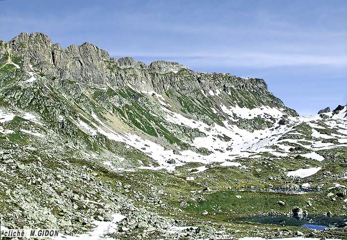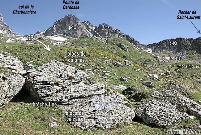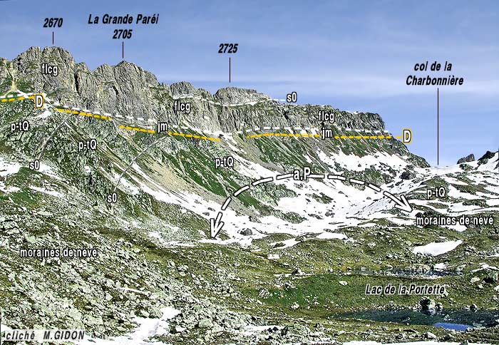 ![]() Partie nord du ressaut soutenant le vallon de La Portette vue du sud, depuis les pentes sous le lac de la Portette En premier plan blocs éboulés, puis incorporés à la moraine, de conglomérat du Crétacé de la Grande Paréi (noter l'hétérométrie et la multiplicité de nature de leurs éléments). a.P = anticlinal de la Portette. |