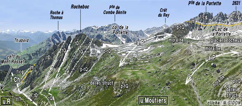 L'étroit vallon qu'emprunte le torrent de la Portette à l'ouest des chalets du Mont Rosset suit la faille des Chapieux : il met en contact, par l'intermédiaire de quelques pointements de cargneules, le Trias du flanc oriental de l'anticlinal de la Portette et le flysch de Tarentaise des alpages de mont Rosset, affecté de plis aigus. Mais il est difficile d'interpréter ce contact comme un chevauchement de sa lèvre orientale, pourtant rapportée à l'unité du Roignais sur la carte géologique, puisque les terrains de cette dernière sont plus récents, donc abaisssés ...