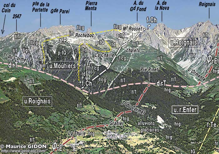 ![]() Les montagnes du groupe du Mont Rosset vues du sud, depuis le sommet du mont Jovet a.P = coupole anticlinale de la Portette; f.Ch = faille des Chapieux (accident séparant ici les unités de Moûtiers et du Roignais) ; d.rT = décrochement de la Roche à Thomas (interprétation nouvelle, inédite, voir page "Roche à Thomas") ; ØrE = chevauchement de l'unité du Roc de l'Enfer ( = front de la zone houillère briançonnaise) ; f.Te = faille de La Terrasse (et d'Aime). |