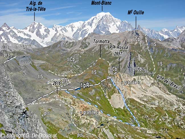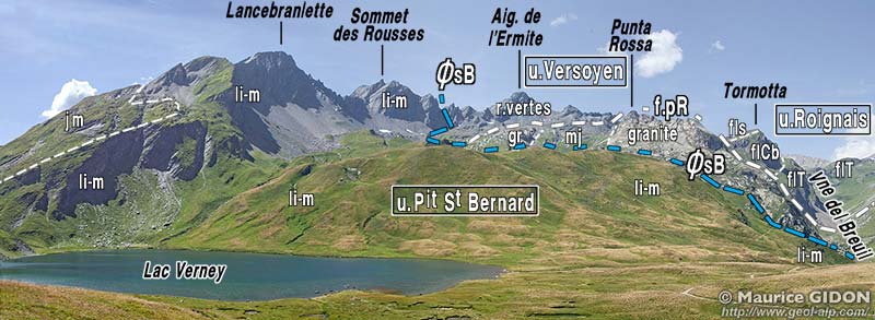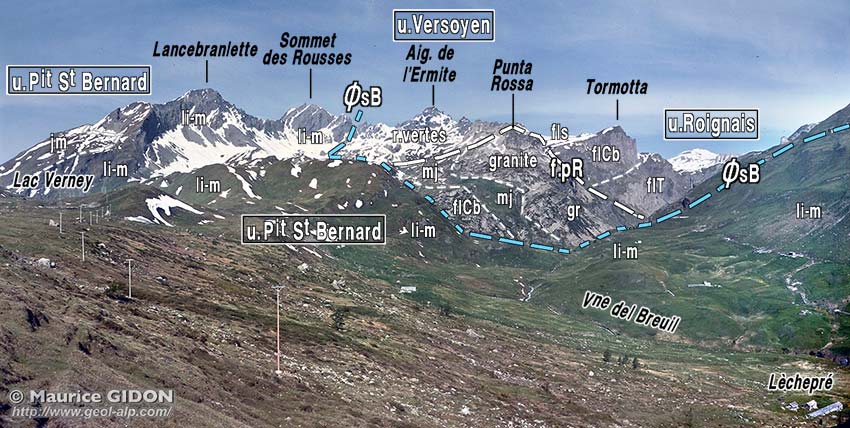 Contrairement à ce qui se passe de l'autre côté de la crête des Rousses on observe ici un contact véritablement chevauchant de l'unité du Petit Saint-Bernard sur l'unité du Versoyen. La faille, beaucoup plus verticale, qui limite ces deux unités sur le versant français se poursuit ici dans le vallon qui limite du côté nord-ouest le sommet arrondi de la Punta Rossa (on peut donc l'appeler "faille de la Punta Rossa").