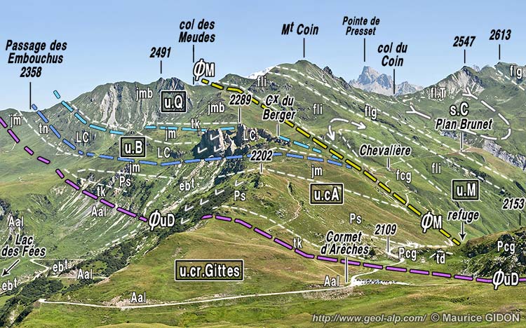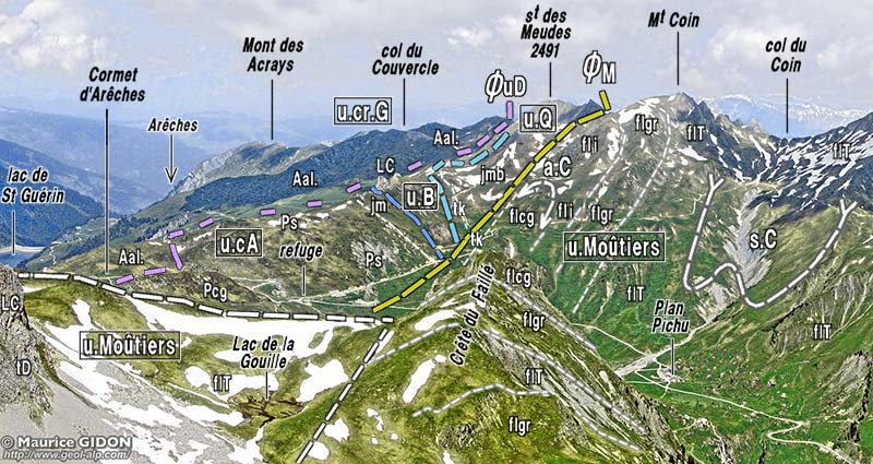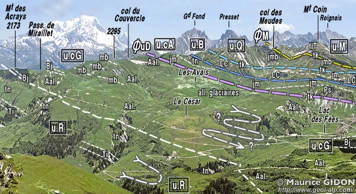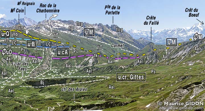 ![]() La rive droite de la vallée supérieure du Pontcellamont, sous le Cormet d'Arêches vue de l'ouest, depuis la Pointe de Riondet. (suite vers la gauche du cliché ci-dessus) ØM (en kaki) = surface de chevauchement frontale des unités valaisanes ; ØuD (en violacé) = surface de chevauchement des unités ultra-dauphinoises. zone dauphinoise : u.R = Unité de Roselend ; u.cG = Unité de la crête des Gittes (concernant la limite entre unité de Roselend et unité de la crête des Gittes voir la page "Beaufortain oriental"). zones ultradauphinoise et valaisane : u.cA = Unité du Cormet d'Arêches ; u.B = unité de la Bagnaz ; u.Q = Unité du Quermoz ; u.M = Unité de Moûtiers mb = lentilles de microbrèches (voir à ce sujet les commentaires complémentaires) La limite tectonique majeure entre Beaufortain occidental et oriental correspond au contact de u.cA (appartenant à la zone ultradauphinoise) sur u.cG (appartenant à la zone dauphinoise). Elle se situe en plein domaine d'alpages, à relief mou ; c'est à l'est du Cormet d'Arêches, lorsque l'on entre dans l'unité de Moûtiers, que se produit par contre un net changement de relief. |