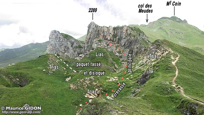 La crête, assez peu déclive mais accidentée, qui s'élève vers le NE depuis le col en direction de l'arête du Mont Coin, est armée par les lames tectoniques imbriquées des unités ultradauphinoises et le sentier qui la suit en offre une coupe assez représentative :
