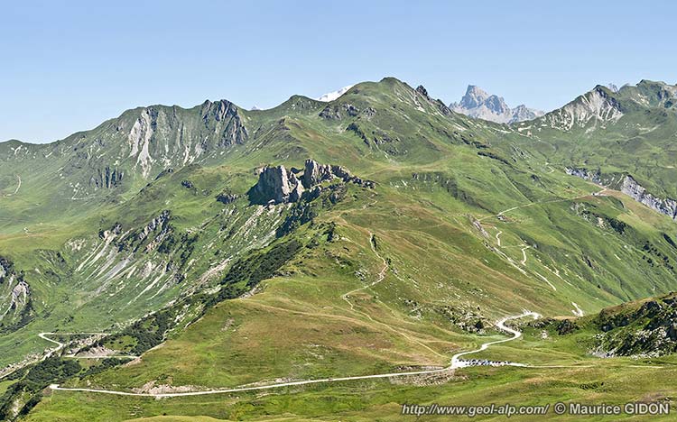L'unité du Quermoz, totalement absente au niveau du col, reprend, quant à elle, une épaisseur notable au revers nord-est de ces tours, pour former la crête des Meudes ; elle s'effile à son tour bien plus au NE, entre le vallon de Treicol et le Cormet de Roselend. |