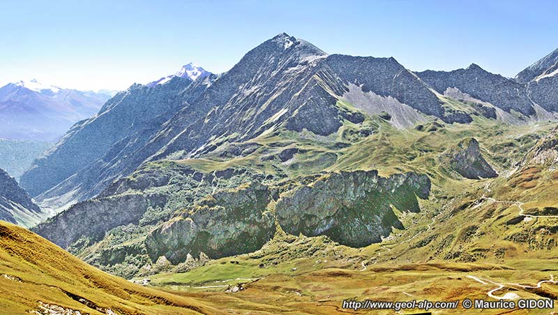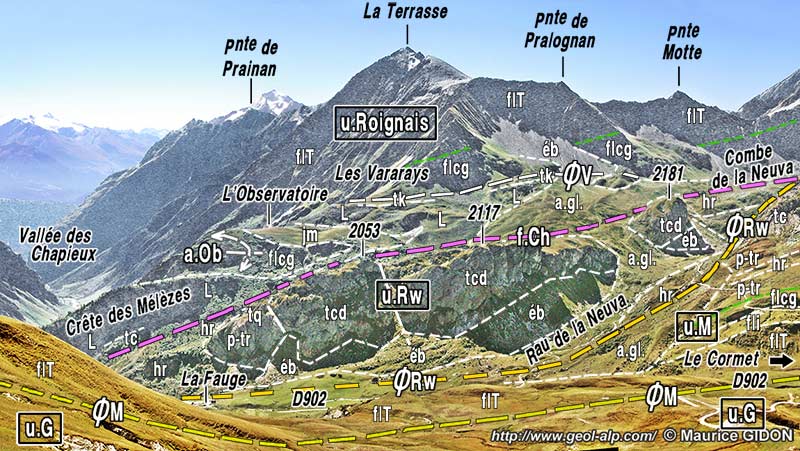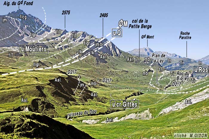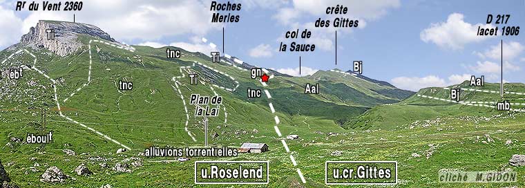 ![]() L'extrémité sud-occidentale de la crête des Gittes (versant est de la Roche du Vent) vues du sud, depuis la route D 217 (de Beaufort au Cormet) au refuge du Plan de la Lai. Le replat alluvial du Plan de la Lai a été créé par l'éboulement du bord gauche du cliché qui, en tombant du Rocher du Vent, a barré le lit du Doron. L'étoile rouge localise le principal des copeaux de gneiss de ce versant : leur présence est censée étayer l'interprétation d'un contact tectonique entre l'unité de Roselend et l'unité de la crête des Gittes. Mais il faut remarquer que l'on peut tout aussi bien envisager qu'on ait seulement là un contact stratigraphique jalonné d'olistolites (plus de d'explications sur ce point, voir en fin de page) ... Cal = calcschistes à oolithes ferrugineuses attribués au Callovien, représentant donc (sans doute) un équivalent latéral des Terres Noires. Bj : la lame de Bajocien du lacet 1906 représente sans doute le coeur d'un synclinal couché (comme c'est le cas pour plusieurs autres affleurements de la même forme, lenticulaire, dans ce secteur). Concernant la présence, à ses abords, de niveaux à microbrèches (mb), voir les commentaires complémentaires. |