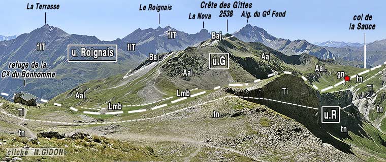 ![]() La crête des Gittes vue d'enfilade, du nord-est, depuis le col de la Croix du Bonhomme. Lmb = microbrèches (attribuées au Sinémurien : voir à leur sujet les commentaires complémentaires). u.R = unité de Roselend ; u.G = unité de la crête des Gittes. (suite du paysage vers la droite à la page "vallon de la Gittaz"). |