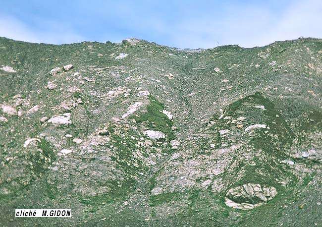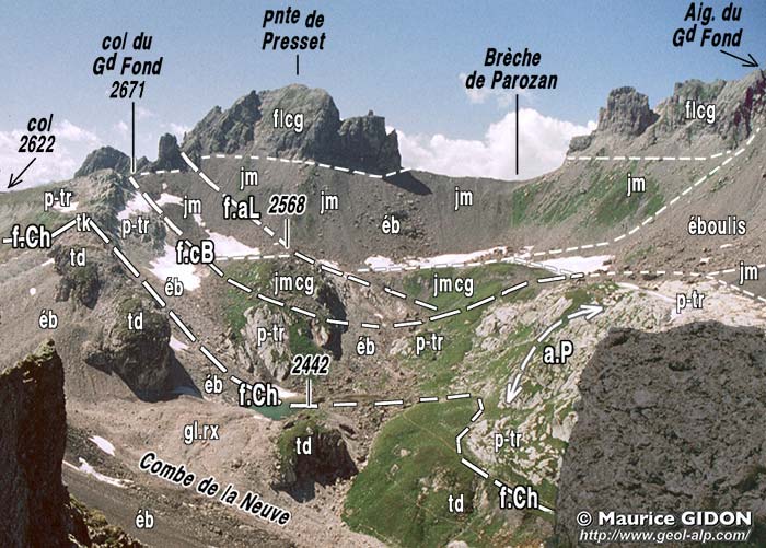 B/ Du côté oriental le chaînon du Grand Fond est bordé par l'entaille, d'ailleurs bien moins profonde, formée au NE par la Combe de la Neuva et dans son prolongement, du côté sud-est, par le vallon de Presset. L'un comme l'autre y mettent à nu le soubassement de matériel basal de la nappe valaisane, formé de Permo-Trias et de Houiller, lequel y affleure en constituant sans ambiguité le prolongement NE de celui qui dessine plus au sud l'anticlinal de la Portette (voir la page "Pierra Menta"). Mais à cette latitude plus septentrionale où l'on est ici ce pli n'est plus représenté que par des fragments de sa voûte (ou de son flanc oriental) au sein d'une une bande disloquée qui est limitée du côté est par le prolongement méridional de la faille des Chapieux.