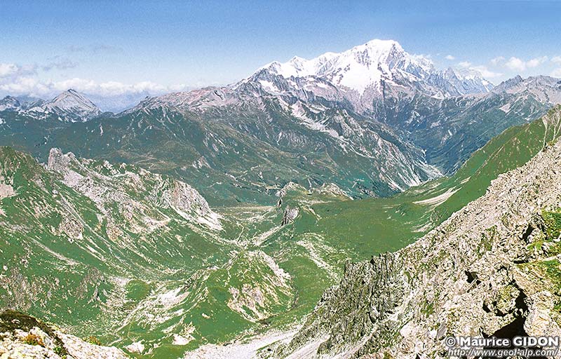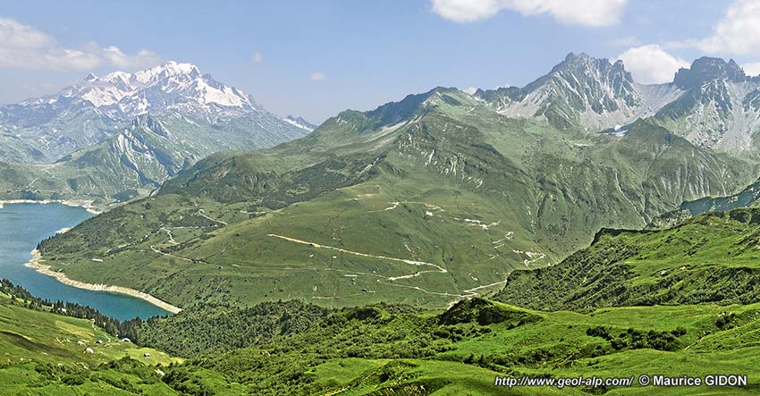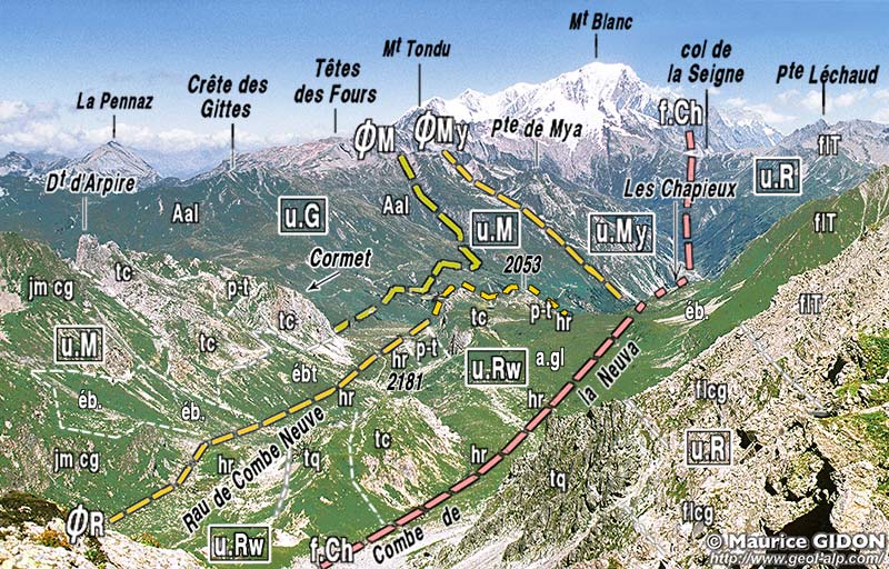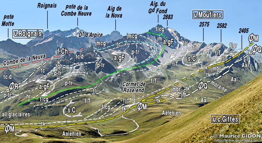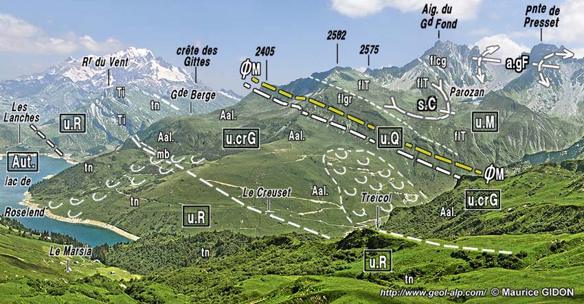 A/ Le versant occidental de ce chaînon montre que le matériel de cette nappe repose sur celui de la zone dauphinoise, plus précisément de l'unité de la Crête des Gittes, formé de schistes argileux, qui affleurent dans les basses pentes en formant une large jupe de croupes herbeuses qui s'étendent depuis le vallon du Cormet de Roselend jusqu'à celui de Treicol. Le contact entre les deux est presque direct, toutefois entre les deux une ligne de ressauts est déterminée, à mi-pente, par les lames de terrain charriées de la zone ultradauphinoise.