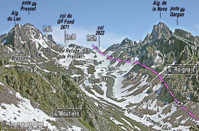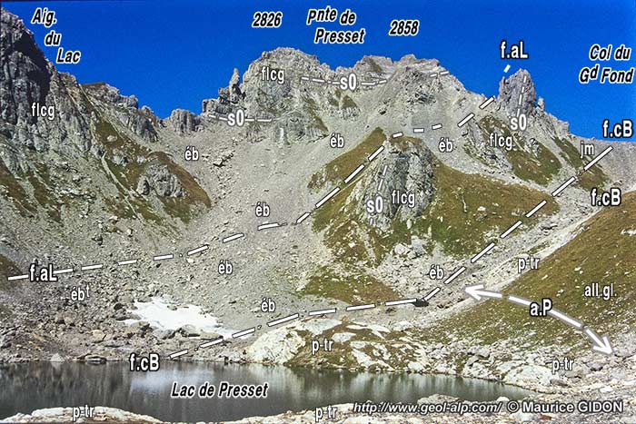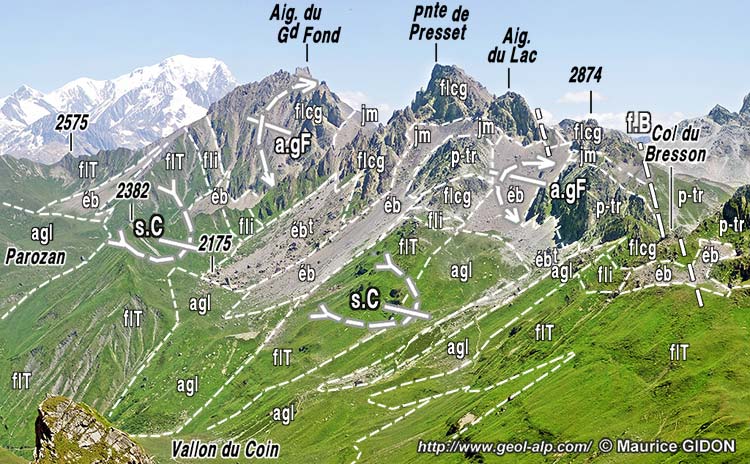 ![]() Le versant sud du col du Grand Fond, vu du SW, depuis le col de la Charbonnière. a.P = anticlinal de Portette (flanc oriental seul visible ici); a.G = anticlinal du Gargan ; f.aL = faille de l'Aiguille du Lac ; f.cB = faille du col du Bresson ; f.Ch = faille des Chapieux. La faille du col du Bresson coupe en biseau le flanc oriental du vaste anticlinal de Portette (à axe presque N-S). Celle des Chapieux coupe l'axe sensiblement E-W de l'anticlinal de Gargan, déversé vers le S-SW : sa formation est peut-être liée à un jeu coulissant dextre de cette faille (voir à ce sujet la page "Roignais"). |