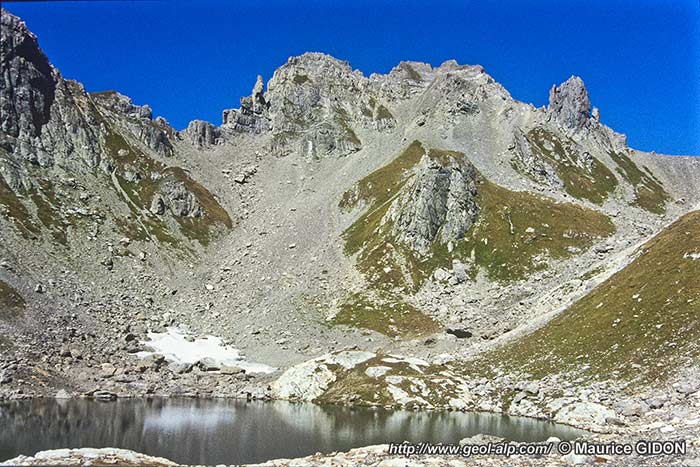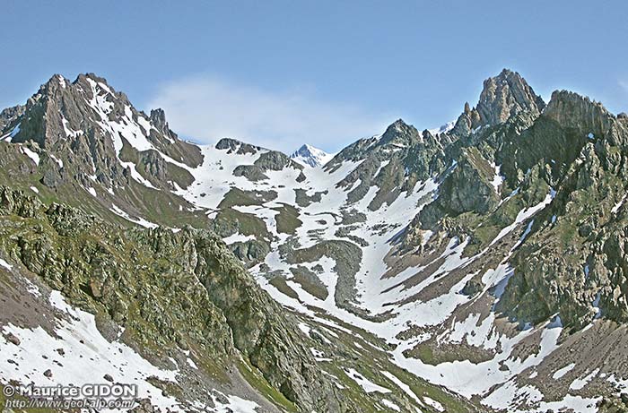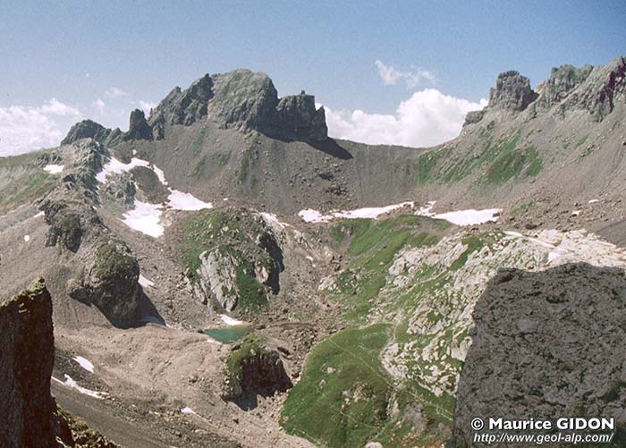 L'arête NE de l'Aiguille du Grand Fond au sud de la Dent d'Arpire (entre les points cotés 2692 et 2643), vue du SE, depuis la Combe de la Neuva. Bel affleurement des mégabrèches du Jurassique moyen : le gros bloc ovoïde de l'angle inférieur droit du cliché mesure environ 10 m de long. |