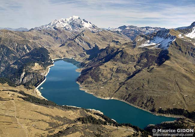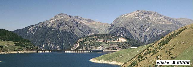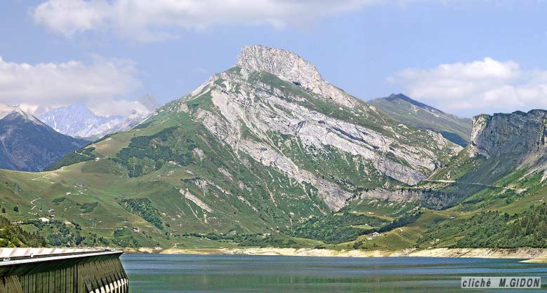 Le lac de Roselend est une retenue entièrement artificielle qui s'étale latéralement à l'amont de son barrage en occupant les deux vallées anciennement confluentes du Doron : celle descendant du Cormet de Roselend et celle du torrent de Treicol. Ce barrage s'appuie sur le splendide verrou* naturel de Méraillet, qui est armé par le bloc de socle cristallin des Enclaves (lequel se situe, du point de vue géologique, à la bordure orientale du rameau interne de Belledonne).