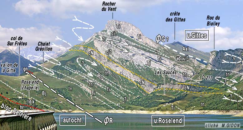 La structure révélée, au Rocher du Vent, par la coupe naturelle du Doron et par l'entaille du vallon de la Gittaz se poursuit vers le NE dans les pentes du versant nord du chaînon de rive gauche du vallon de la Gittaz, jusqu'aux Roches Merles, secteur où l'on peut analyser ses rapports avec celle de l'extrémité méridionale du massif du Mont Blanc. |