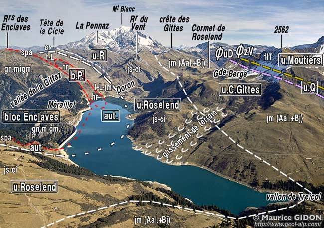 ![]() Le lac de retenue de Roselend, vu du sud-ouest depuis l'aplomb du Mont des Acrays. aut. = couverture autochtone proprement dite des blocs de socle ; b.P = bloc de la Grande Pierrière (voir la page Girotte) ; cr = lame de roches cristallines de Roselette (base de l'unité de Roselend) ; u.R = unité de Roselend (Jurassique supérieur à Crétacé inférieur calcaréo-argileux) ; u.cG = "unité de la Crête des Gittes" (Jurassique moyen) ; ØuD = surface de chevauchement des unités à affinités ultradauphinoises (= principalement ici unité du Quermoz : u.Q) ; ØzV = surface de chevauchement des unités de la zone valaisane. |