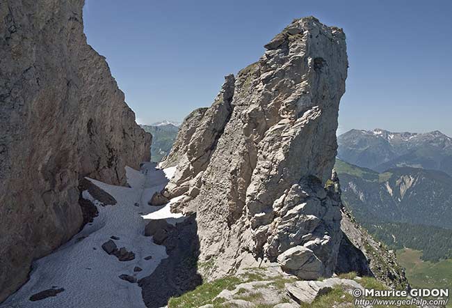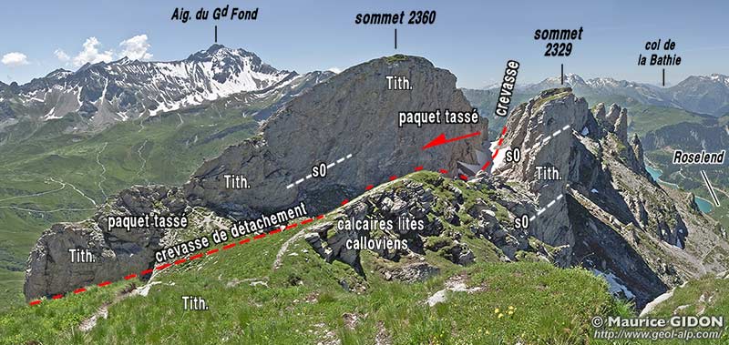 On pourrait croire que c'est la lame rocheuse occidentale (celle à droite sur le cliché, qui culmine à 2329m et qui domine le versant du lac de la Gittaz), qui s'est détachée du reste de la montagne. Il n'en est rien, d'une part parce que le tracé d'ensemble de la crevasse est arqué avec une concavité vers le sud-est, d'autre part parce que c'est uniquement dans cette direction, celle du pendage des couches, que la dalle tithonique pouvait glisser. En réalité le compartiment tassé est celui constitué par l'arête rocheuse principale (point coté 2360). |