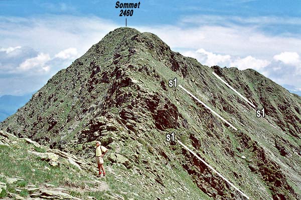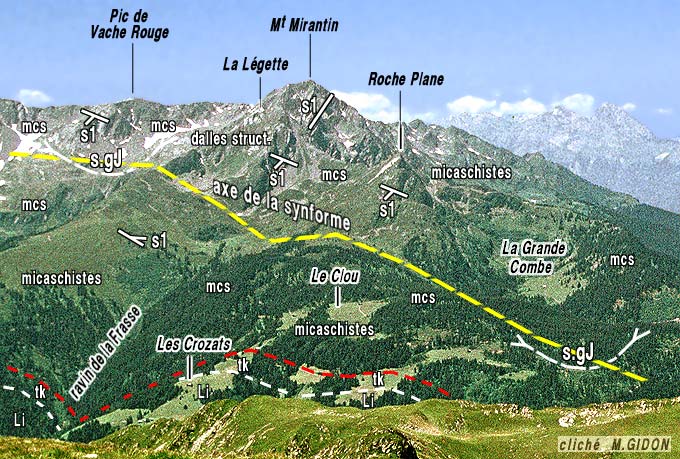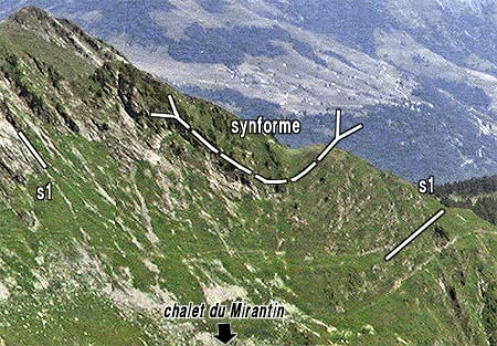 de la crête orientale de la Légette (agrandissement du cliché ci-dessus), montrant le dessin, par la foliation métamorphique (s1), de la synforme de la Grande Journée. |