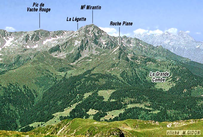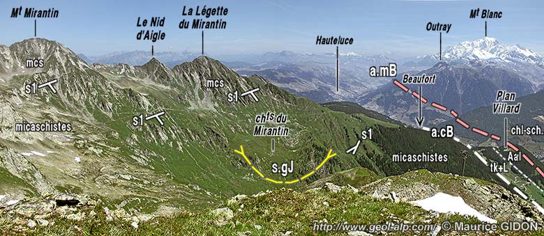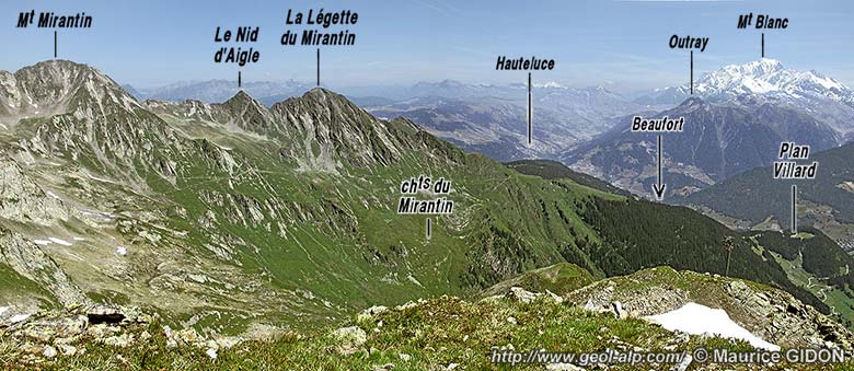 Le sommet même du Mirantin se trouve au départ de la crête de la Légette, encore assez lourde, mais cependant plus nerveuse ; elle s'abaisse en direction du NE vers Beaufort en déterminant le verrou de la vallée de l'Argentine qui domine cette localité et la sépare de celle d'Arêches. Cette crête secondaire est au contraire plutôt orientée NE-SW, c'est-à-dire selon la direction de la foliation des micaschistes. C'est la raison pour laquelle son versant oriental est en grande partie formé de larges plaques rocheuses qui plongent à plus de 45° vers l'est - sud-est : ces plaques sont des dalles structurales qui ont été débités selon le pendage de la foliation.