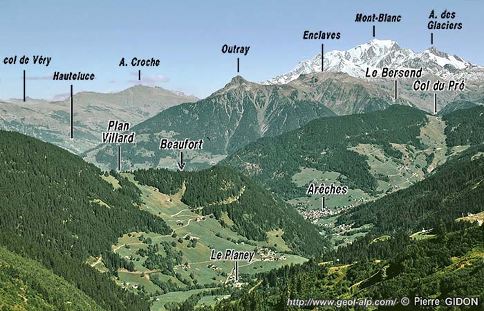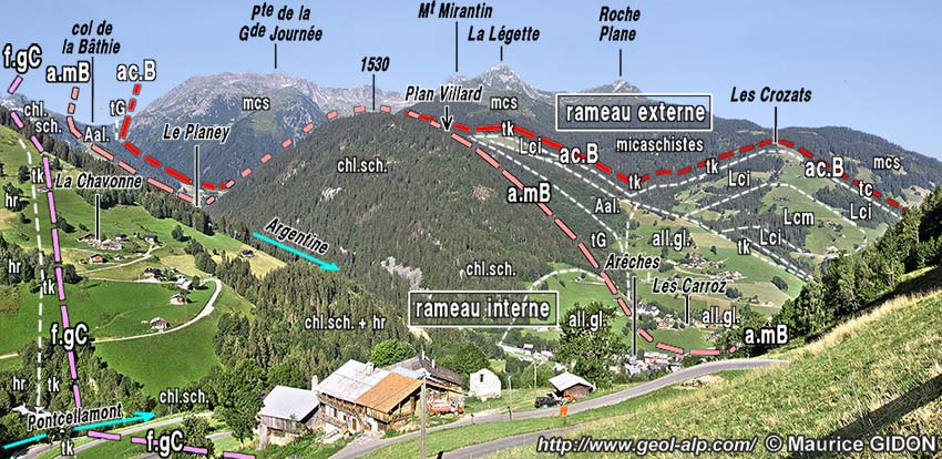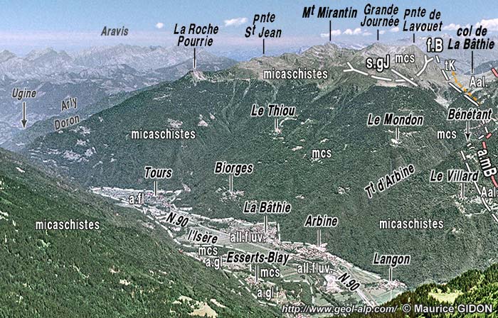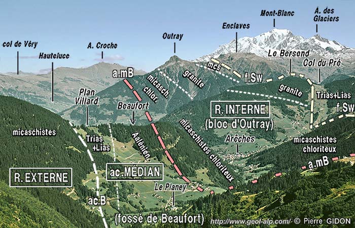 ![]() La dépression d'Arêches vue du sud-ouest, depuis le col de La Bâthie. Dans cette direction on a une vue d'enfilade de l'extrémité septentrionale de l'Accident médian de Belledonne. Depuis le col de La Bâthie en passant par Beaufort il est constitué par un fossé d'effondrement (un "graben") dont le contenu sédimentaire s'épanouit vers le nord pour se connecter, sous l'Aiguille Croche, à la couverture sédimentaire du Rameau externe de Belledonne. Arêches est visible dans l'enfilade de la vallée de l'Argentine. Celle-ci suit le fossé de Beaufort dans son cours amont, sous le col de la Bâthie, mais s'en échappe en aval du village du Planey. ac.B = accident du col de la Bâthie, limitant le fossé sédimentaire de l'Accident médian de Belledonne du côté occidental ; a.mB = faille principale, orientale, de l'Accident médian de Belledonne ; f.SW = faille principale (occidentale) du graben du Sallestet. |