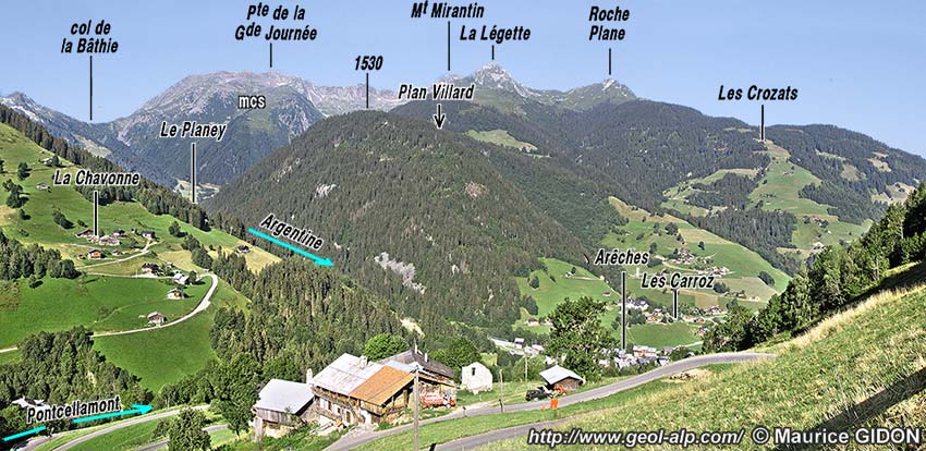Plus bas encore le versant oriental de la crête principale, Mirantin - Grande Journée, est traversé en oblique par une bande de terrains sédimentaires, bien plus tendres (cargneules et calcaires argileux du Lias) : il s'agit du remplissage du fossé (hémigraben*) de l'accident médian de Belledonne. Elle détermine l'épaule de Plan Villard et, plus au nord, les pentes basses de la montagne jusqu'au lit de l'Argentine en aval d'Arêches.