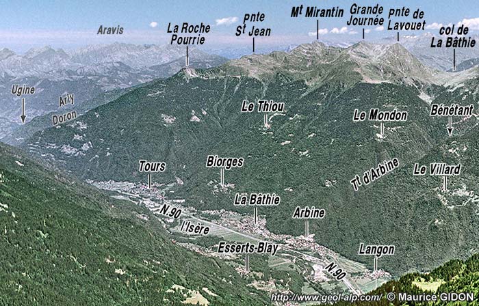 Le groupe montagneux du Mont Mirantin (2461 m.) représente l'extrémité ouest de la crête de partage des eaux entre l'Isère (Basse Tarentaise) et le bassin du Doron (Beaufortain proprement dit). Il se termine du côté ouest par une échine qui, entre Arc et Doron, s'abaisse jusqu'à la Combe de Savoie à Albertville. Cette sentinelle occidentale de la partie méridionale du massif du Beaufortain est séparé du groupe, plus oriental, du Grand Mont par le Col de la Bâthie dont la profonde coupure correspond à une fracture majeure séparant les prolongements septentrionaux des massif cristallins de Belledonne externe et interne (voir la page "Belledonne généralités").