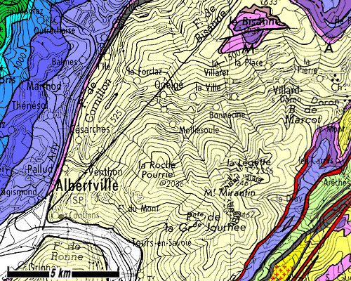 Dans le versant oriental du Mirantin le contenu sédimentaire de l'accident médian repose pratiquement sur la surface de la pénéplaine anté-triasique. Mais en s'élevant vers le col de la Bâthie, la limite socle cristallin - couverture prend un caractère de plus en plus tectonique car on y observe la troncature de la base de la succession liasique et le remplacement des couches triasiques par une lame de cargneules. Dès le niveau de Plan Villard les schistes aaléniens ne sont plus séparés du socle que par cette bande de cargneules que frange seulement une lame de marno-calcaires hettangiens ; celle-ci disparaît d'ailleurs plus haut sur les deux versants du col : ce contact correspond donc là franchement a un accident du col de la Bâthie qui limite du côté ouest le contenu sédimentaire de l'accident médian. |