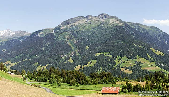 La rive gauche de la vallée d'Hauteluce et la montagne d'Outray, vues de l'ouest depuis les abords du hameau des Culas sur la D.218, 3 km au sud-est des Saisies (suite de ce paysage, vers la gauche : ci-dessous).