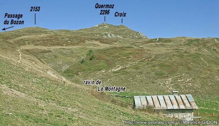 Le versant sud du sommet du Quermoz, vu des chalets d'altitude 2010 du sommet du ravin de la Montagne ...