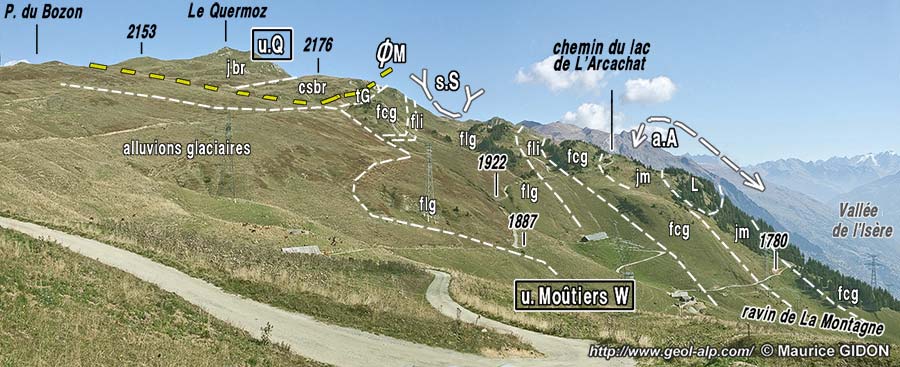u.Q = unité du Quermoz ; ØM = chevauchement de l'unité de Moûtiers ; s.S = synclinal de Sizery ; a.A = anticlinal de l'Arcachat.