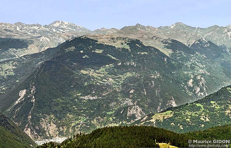 de Naves, du côté oriental la moyenne Tarentaise dans le secteur de Montgirod et de l'Étroit du Sciaix. Plus au sud il se transforme en versant de rive droite de l'Isère qui s'abaisse par les villages de Hautecour jusqu'à Moûtiers.