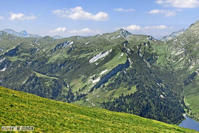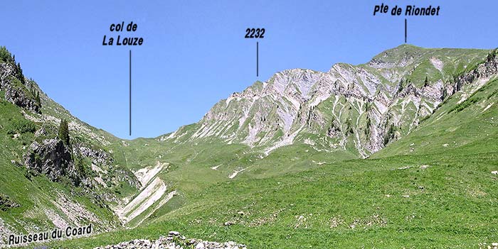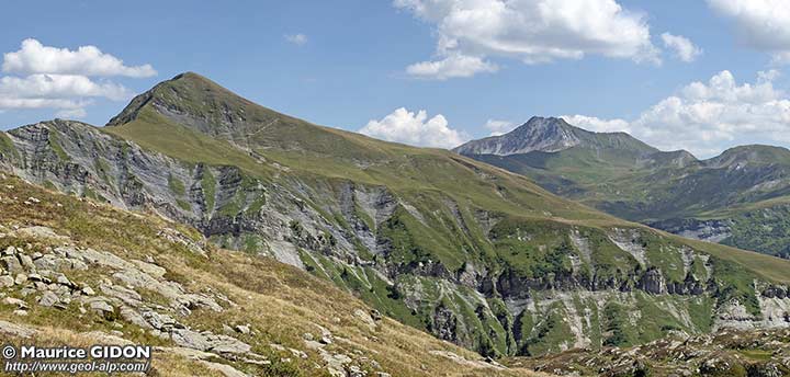 Sur les deux versants de cette crête la montagne est constituée par une succession de croupes garnies d'alpages que drainent des ravines sauvages entaillées dans des schistes noirs. On est frappé par le changement brutal d'aspect du relief de ce secteur, par rapport à celui, immédiatement plus occidental du Grand Mont : c'est le résultat évident du passage, de part et d'autre du col de La Louze, depuis un domaine où est mis à nu le socle cristallin jusqu'à celui où il reste partout masqué par sa couverture sédimentaire (voir aussi la page "Grand Mont") .