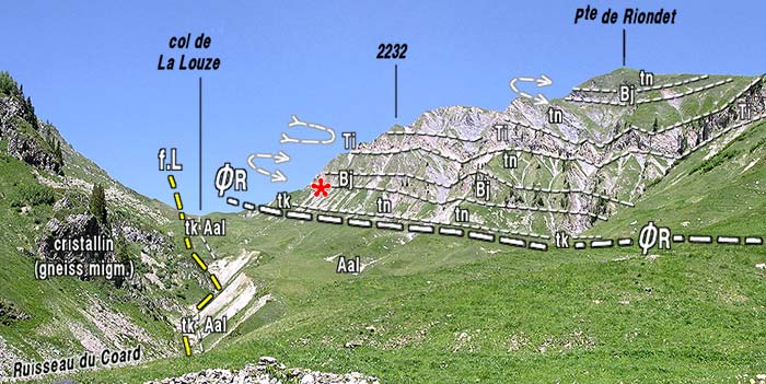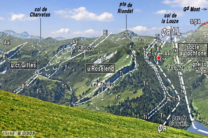 ![]() Le versant septentrional de la Crête de Riondet vu du nord-est, depuis le Mont des Acrays f.L = faille de la Louze ; ØR = chevauchement de l'unité de Roselend. L'astérisque rouge indique l'emplacement des copeaux de schistes cristallins de La Louze (qui jalonnent le chevauchement de l'unité de Roselend) s.pa = témoins les plus bas de la surface de la pénéplaine anté-triasique sur le bloc de socle cristallin autochtone du Grand Mont. Concernant la limite entre unité de Roselend et unité de la crête des Gittes voir la page "Beaufortain oriental" |