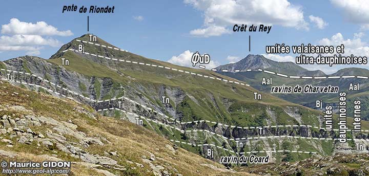 En définitive l'unité de la crête des Gittes ne représente sans doute pas une entité tectonique individualisée mais représente simplement le flanc oriental d'un grand synclinal, replissé et cisaillé sous le chevauchement des écailles ultradauphinoises. Son épaisseur est accentuée par des replis couchés qui se manifestent par d'étroites bandes d'alternances marno-calcaires du Bajocien, lesquelles représentent des synclinaux pincés. Une barre de calcaires tithoniques y court même dans le haut de la partie la plus abrupte du versant de la Grande Maison : elle représente le cœur d'un "synclinal du Roc Marchand" (voir la page "Naves"). En fait ce dernier pli est l'accident axial, principal, d'un grand synclinorium* qui affecte avec continuité le contenu de l'hémigraben de la zone dauphinoise orientale, sur toute sa longueur depuis loin vers le sud (Les Deux Alpes et la vallée de la Romanche, voir la page "Chambon"), jusqu'aux approches du massif du Mont Blanc (voir les pages "Col du Bonhomme" et "Beaufortain oriental"). |