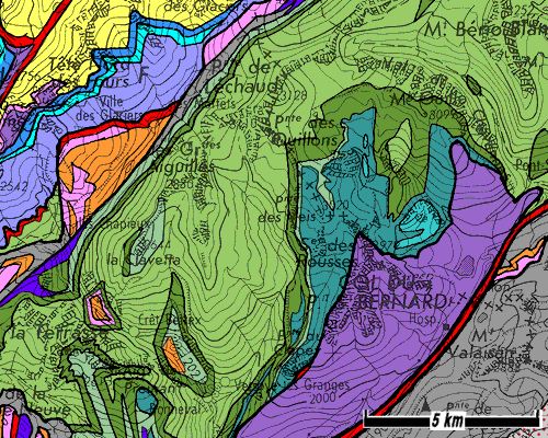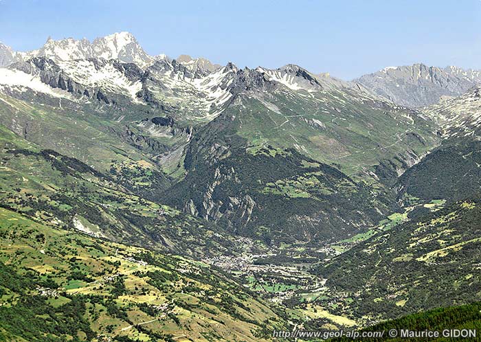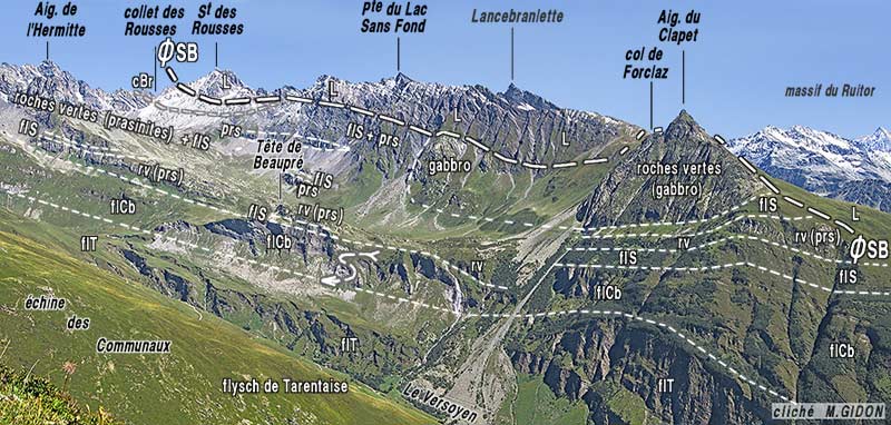 Mais à partir du Miravidi, en direction du sud, la crête frontière et les pentes qui en descendent en rive gauche (orientale) du Versoyen se singularisent par le développement qu'y prennent les affleurements de "Roches Vertes" (prasinites, serpentinites, gabbros). Ce trait a été classiquement considéré comme une caractéristique de la zone valaisane*.