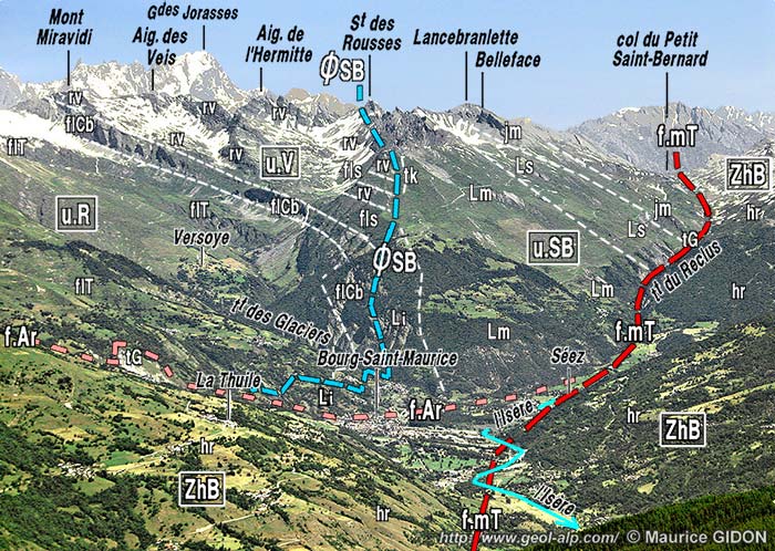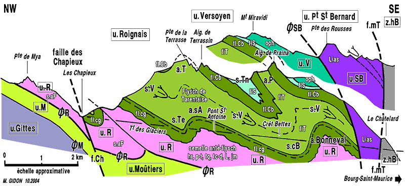 N.B. : Dans une publication récente (H.Masson et al. [2006]) il est affirmé que le contact ØSB n'est pas tectonique et que les sédiments liasiques de l'unité du Petit Saint-Bernard reposent stratigraphiquement, de façon discordante, sur le matériel ophiolitique du Versoyen. D'autre part, pour ces auteurs, ce matériel du Versoyen serait disposé à l'endroit et charrié sur un olistostrome alimenté par ce matériel lui-même (affleurements de la Tête de Beaupré et de Méchandeur), constituant la partie sommitale de la succession du flysch de Tarentaise. Les couches de ce flysch qui supportent les ophiolites, en rive gauche du torrent du Versoyen, ne seraient donc pas renversées mais à l'endroit. |