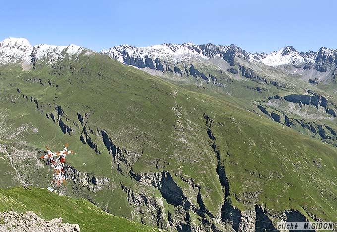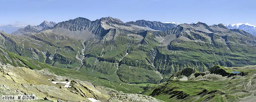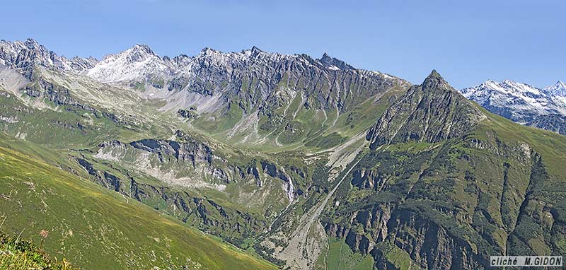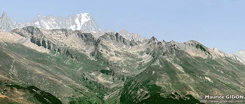 Les crêtes qui se développent en rive gauche (à l'est) du torrent des Glaciers, au sud du col de la Seigne, sont essentiellement sculptées dans la nappe des brèches de Tarentaise.