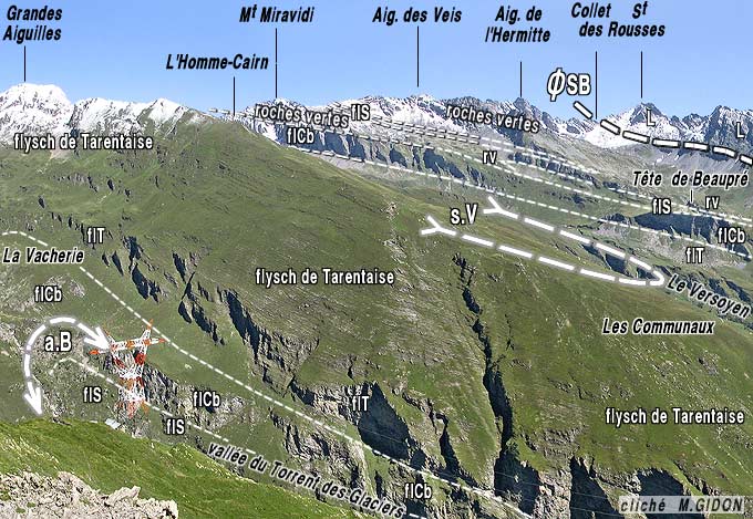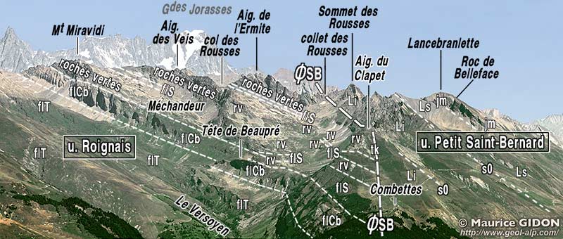 ![]() Vue d'ensemble des crêtes et du haut vallon du Versoyen, vus du sud - sud-ouest depuis le Mont Jovet Cette vue est prise à une altitude (2550 m) et à une distance suffisante pour éviter les déformations perpectives de sorte qu'elle donne pratiquement une coupe de la structure (comparable à la coupe supérieure ci-après). L'accident (ØSB) qui juxtapose les couches du Jurassique de l'Unité du Petit Saint-Bernard aux diverses "roches vertes" du Versoyen, rapportées à l'unité du Roignais est vu presque d'enfilade. Ceci met en évidence son obliquité marquée, à la fois par rapport à la stratification (s0) des calcaires et calcschistes du Petit Saint-Bernard (à droite) et (à gauche) aux diverses couches de schistes noirs (flS) et de "roches vertes" de l'unité du Roignais, notamment dans le revers SE (droit) de l'Aiguille du Clapet (voir la remarque "N.B." en fin de page) rv = prasinites, serpentinites, gabbros (ces derniers à l'Aiguille du Clapet) ; flCb = calcaires à microbrèches représentant les couches de base de la succession du flysch de Tarentaise (flT) ; Li = Lias inférieur plutôt calcaire ; Ls = calcschistes du Lias supérieur - Jurassique moyen ; jm = calcaires argileux lités du Jurassique moyen. |