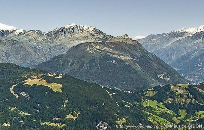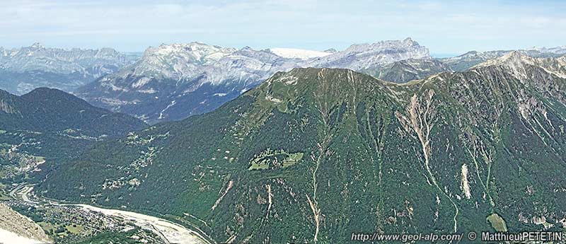 ![]() L'extrémité sud-occidentale du massif des Aiguilles Rouges vue du SW depuis le sommet du Mont Joly. La vallée de l'Arve se coude à 90° pour franchir l'extrémité méridionale du massif en prenant la direction de la bande de terrains (principalement houillers) qui séparent les gneiss du Brévent et des Aiguillettes de ceux de Saint-Gervais (voir la page "Prarion"). |