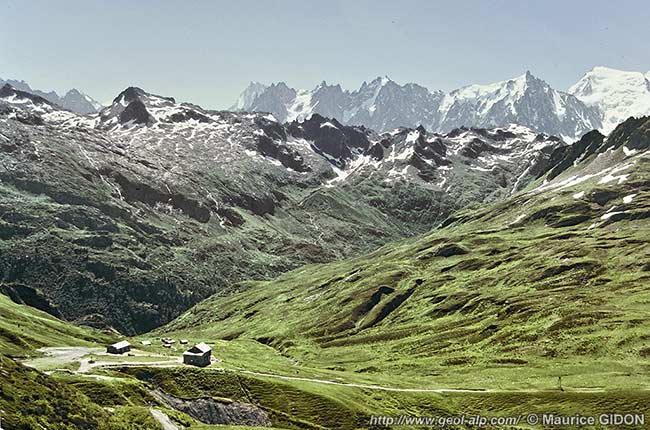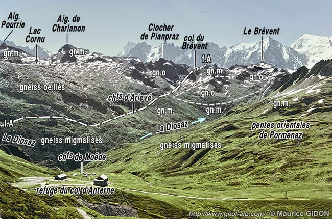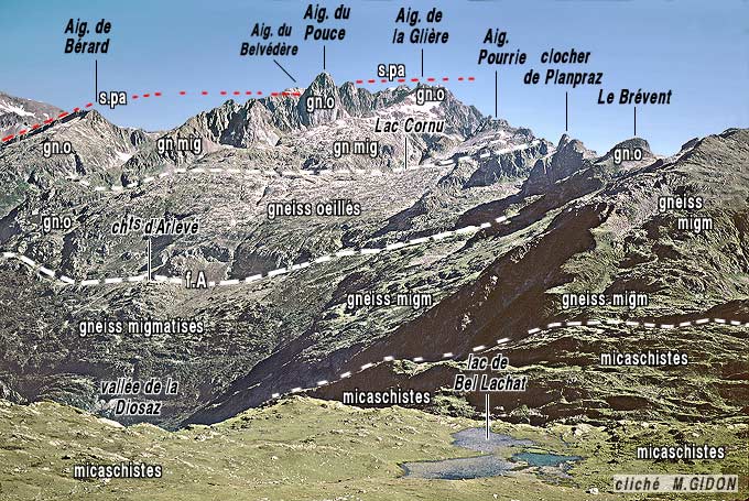 Le relief du chaînon du Brévent et des Aiguillettes se révèle totalement indépendant de sa structure, comme en atteste le fait que les bandes de schistes cristallins de différentes natures y traversent obliquement crêtes et vallons sans en déterminer aucun. Ce glacis incliné vers le NW est clairement le résultat d'une érosion glaciaire due à la présence, vers la fin de la glaciation de Würm, d'une calotte glaciaire, inclinée vers l'ouest, qui devait surplomber le fleuve de glace occupant la vallée de Chamonix ...